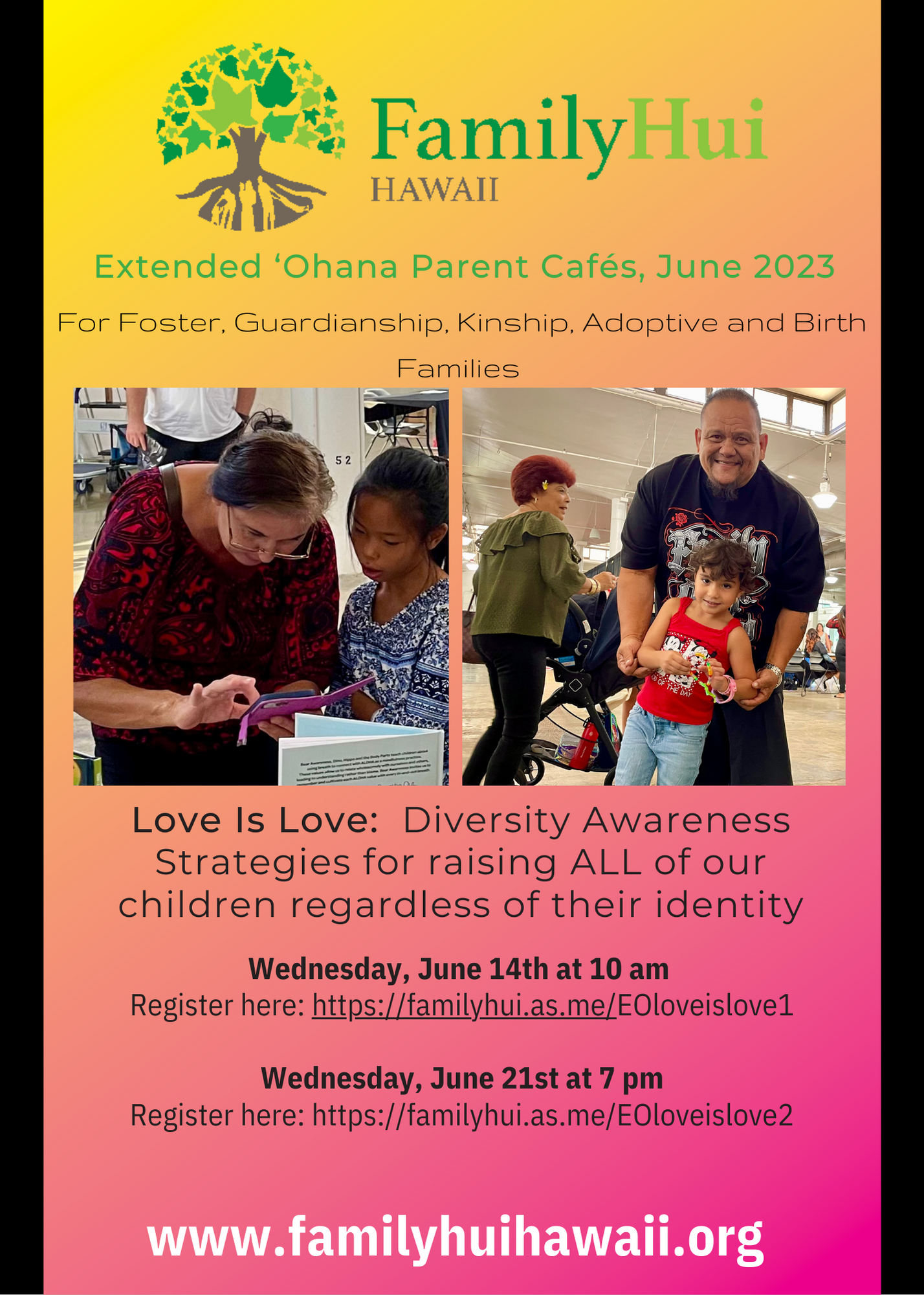 If you or someone you know is a Resource Caregiver, Foster, Guardianship, Hanai, Adoptive or a Birth Family involved in the Child Welfare System, join our Extended 'Ohana programs! These Parent Cafe' are tailored to the journey foster families face, and is facilitated by parents with lived experience.